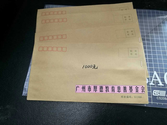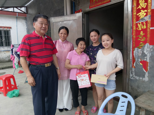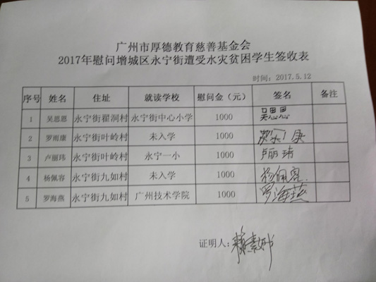 2017年5月7日,增城区受特大暴雨的袭击,多地出现灾情,其中中新镇九和村,永宁街九如村、翟洞村、叶邻村等受到了洪水的肆虐,出现了严重的灾情。“洪水无情‘厚德’有情”,我会得知这次灾情后,于2017年5月12日和区关工委负责人、老领导等,组织成员召开会议,挑选了10位贫困学生家庭(其中中新镇5名,永宁街5名),每个学生资助人民币1000元,共计1万元,还有中华传统经典、笔记簿等礼物,我们组成10多人班子,前往灾区慰问受灾贫困学生。