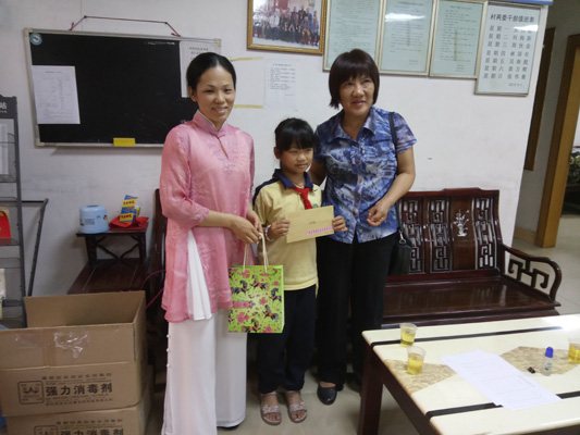 第一站来到永宁街九如村,通过与村委领导的沟通,得知九如村受灾贫困学生有杨佩容,罗海燕。我们分别对这两位学生送上1000元的慰问金和一份礼物。