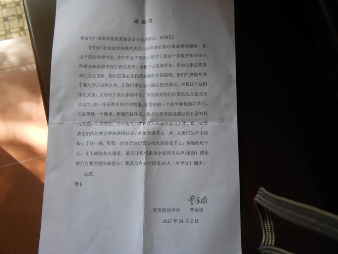 这是曾金添给厚德基金会写的一封感谢信
